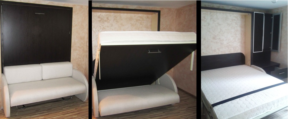 Этот тип мебели трансформера коренное отличие от старой модели: полноценная кровать преобразуется в не менее полноценный и удобный диван. Кровать в данном варианте крепится вертикально, в основном матрасы полуторные и двуспальные.