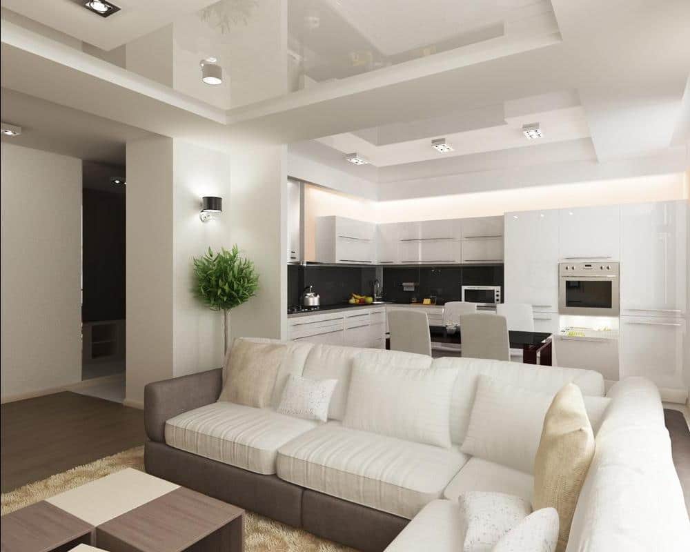 Также неплохим решением будет многоуровневый потолок из гипсокартона. Единственный минус такого оформления потолка — уменьшение высоты на 8-10 см, но использование дополнительных источников освещения: точечные потолочные светильники, подвесные бра или светодиодная лента, делают это уменьшение незаметным.