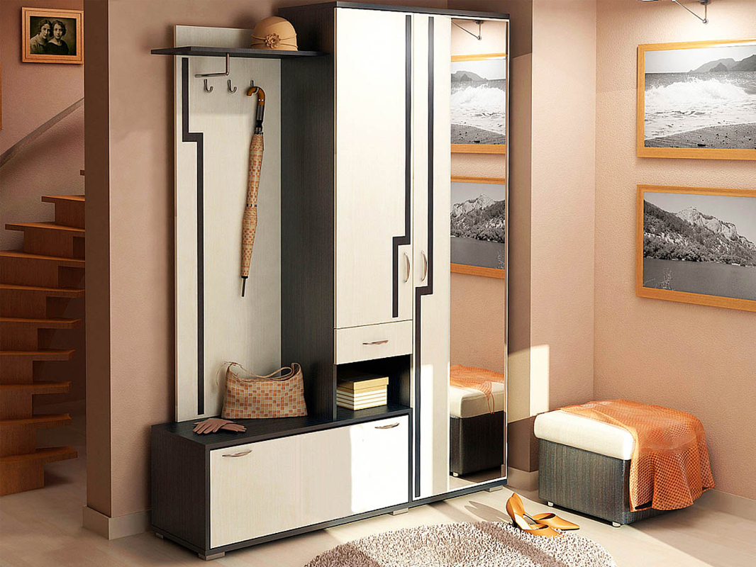 Привычный набор мебели: шкаф для верхней одежды, открытая вешалка или крючки для повседневных вещей, решетка для грязной обуви и полка для сухой или узкая обувница (шкаф для обуви), тумбочка или комод для хранения мелочей.