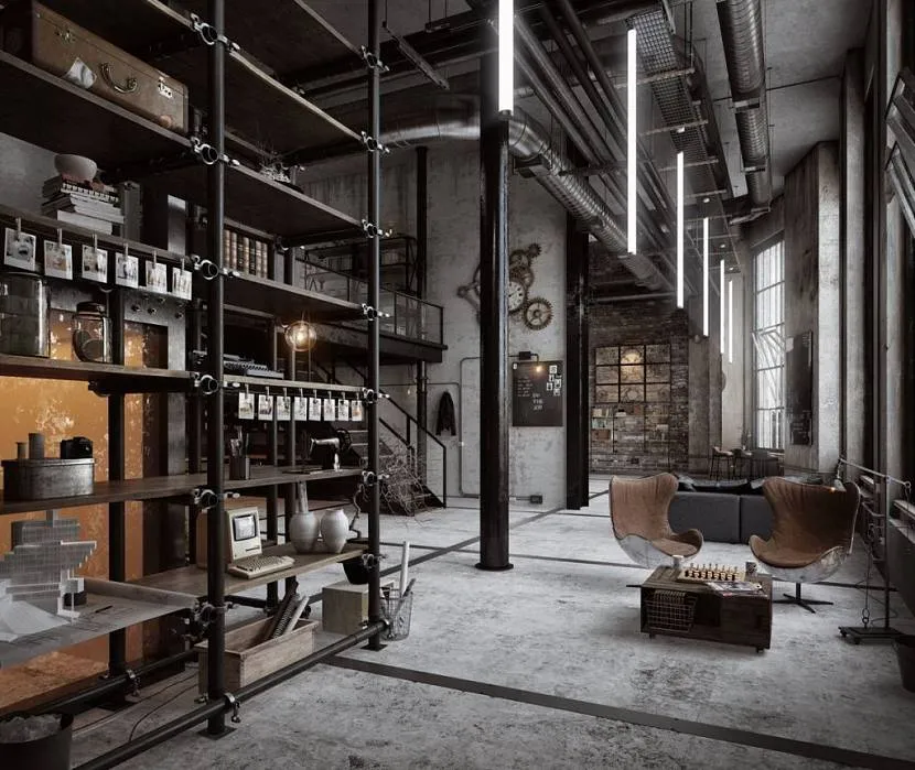 К первому относятся интерьеры с ярком выраженным акцентом на промышленный дизайн. Здесь вы увидите много металла, мебель, наспех состряпанную из поддонов и другие характерные черты. С потолка свисают прожекторы или проходит алюминиевая труба, массивный коллектор, вентиляция. В стенах может проглядывать арматура.