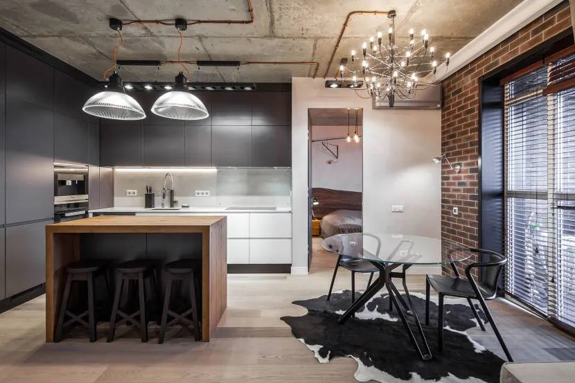 Зона кухни занимает небольшое количество свободного пространства. Делается акцент на утилитарное назначение, поэтому комната напоминает пункт приема пищи. При обустройстве используют барные стулья, массивные столешницы, бытовую технику, необычную посуду. В качестве аксессуаров применяют растения, фотографии, часы и лаконичные картины.