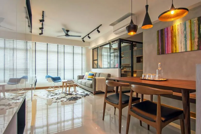 Зонирование пространства лучше организовать при помощи цвета, прозрачных или стеклянных панелей, стеллажей или обычных ширм. Также можно поэкспериментировать со светом, что будет максимально уместно для данного направления.