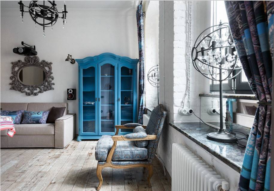 Цветовые приемы практически идентичны вышеуказанным направлениям, однако в качестве дополнений используют яркие краски. Они служат акцентами и разбавляют нейтральную гамму. В качестве дополнительных красок чаще всего используют красный, синий, оранжевый или фиолетовый.