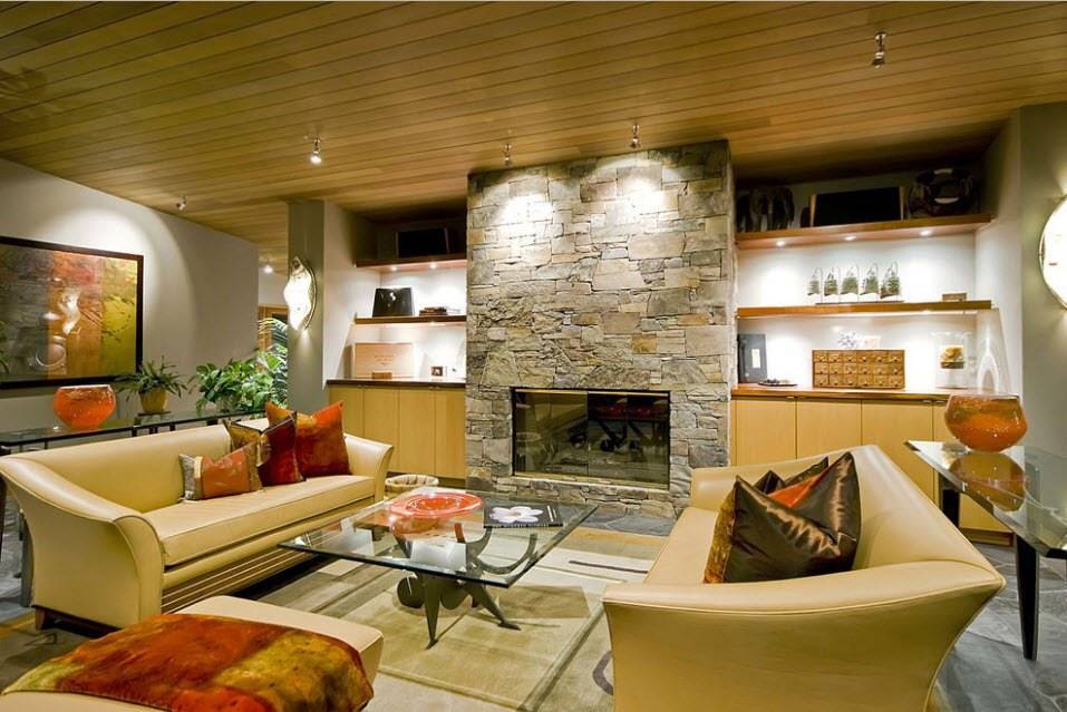 Отлично смотрится в интерьере больших загородных домов и коттеджей, но точно не в городских квартирах. В комбинации с металлическими кованными элементами (канделябрами, лестницами, каминными решетками), изобилием дерева (потолочные балки, мебель, полы) каменная отделка выглядит очень благородно. Она должна состоять из камешков разной величины, между которыми выделяется затирка. Светлый доломит и теплый песчаник будут смотреться уютно и органично.