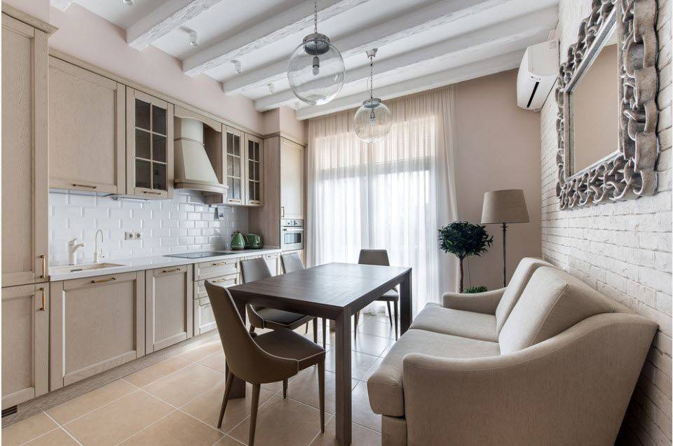 Ведущая роль в этом стиле отдана белому и бежевому цвету, но присутствует и коричневый. Можно сделать интерьер более броским, дополнив его шоколадным оттенком или венге, а можно визуально смягчить интерьер, выбрав ореховый или кофейный коричневый. Сделайте акцент на нарочито грубые и необработанные поверхности.