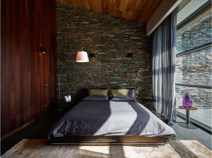 Такой стиль оформления интерьера напрочь лишен деталей и декора, поэтому каменный акцент здесь станет своеобразной изюминкой, привлекающей внимание. В минимализме крайне редко встречаются полностью покрытые камнем стены, но зато применение его в качестве зонирования помещения очень приветствуется. Пожалуй, нарочитая фактурность каменной кладки будет противоречить атмосфере минимализма, а вот однотонные полуглянцевые гладкие плиты идеально дополнят лаконичный интерьер