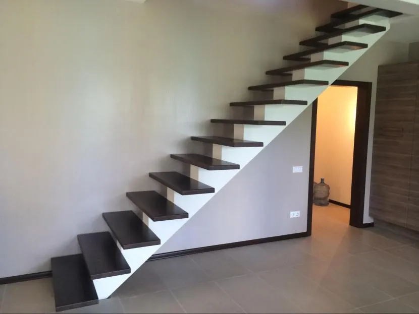 Каркасы для ступенек фиксируются непосредственно к поверхности стены посредством элементов крепежа. Благодаря этому создаётся визуальный эффект парящей лестницы. Материалов на её изготовление уходит минимум и места она занимает совсем немного. Однако естественной платой за это является низкая несущая способность.