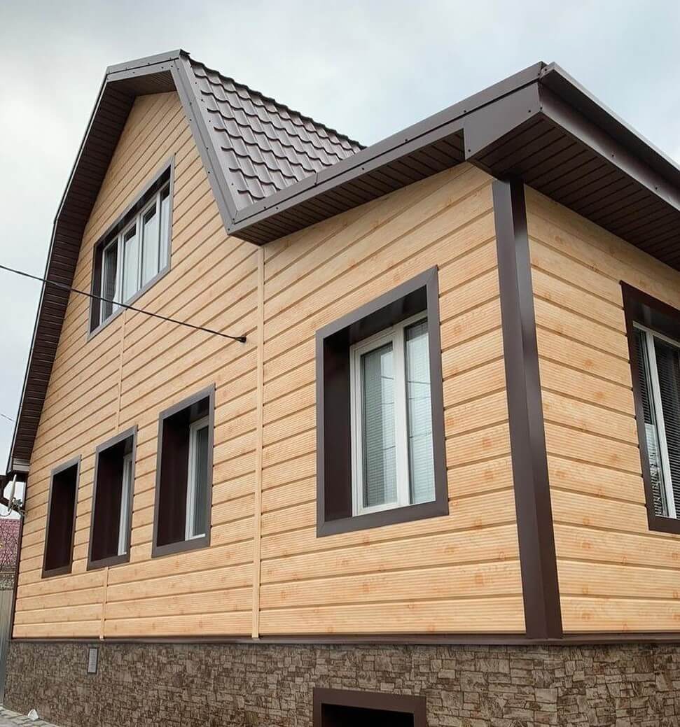 Сочетание двух видов сайдинга: под натуральное дерево и серый кирпич