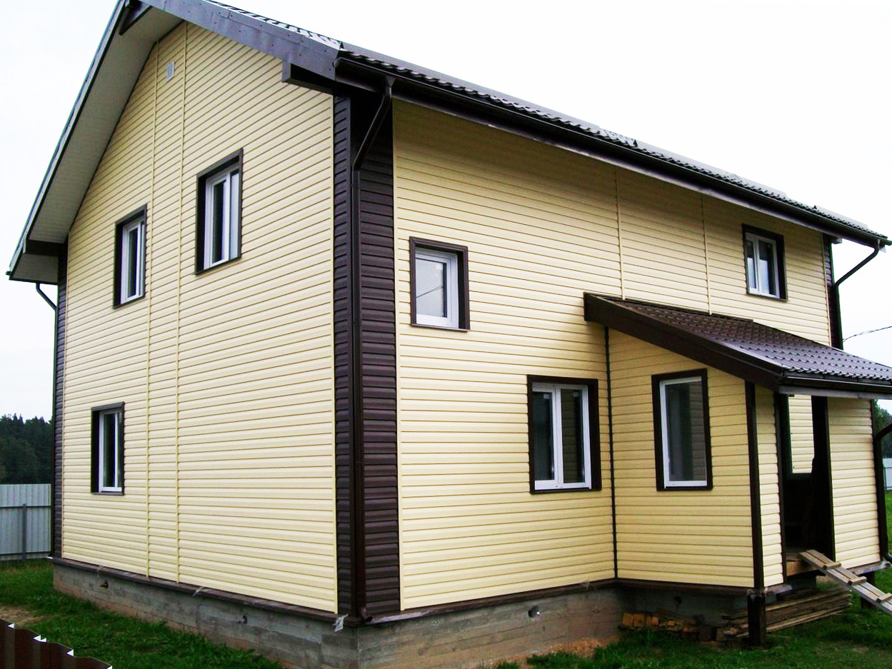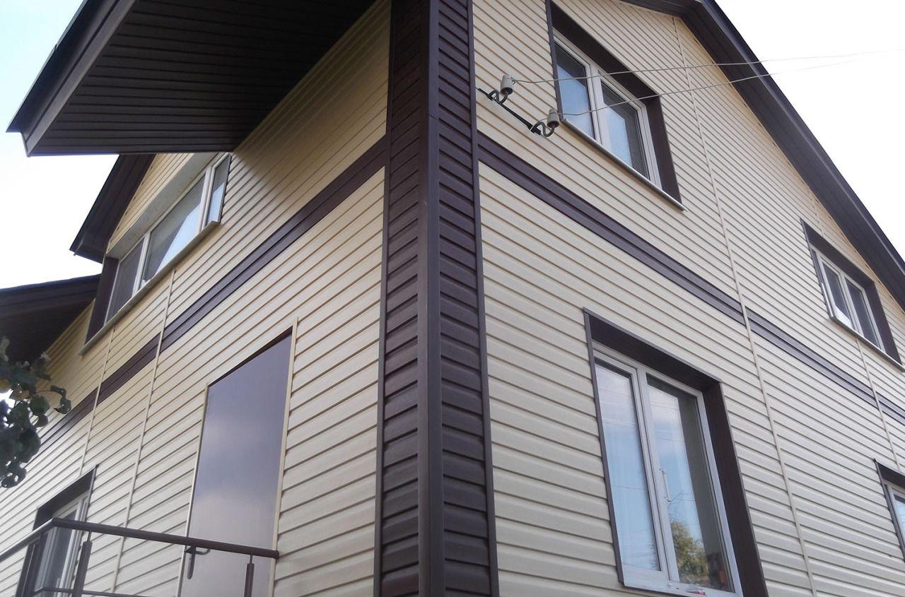 Нередко дома отделываются металлическим сайдингом разных цветов. Например, на одной постройке все стены могут быть обшиты белыми, а углы – темно-коричневыми или бордовыми панелями.