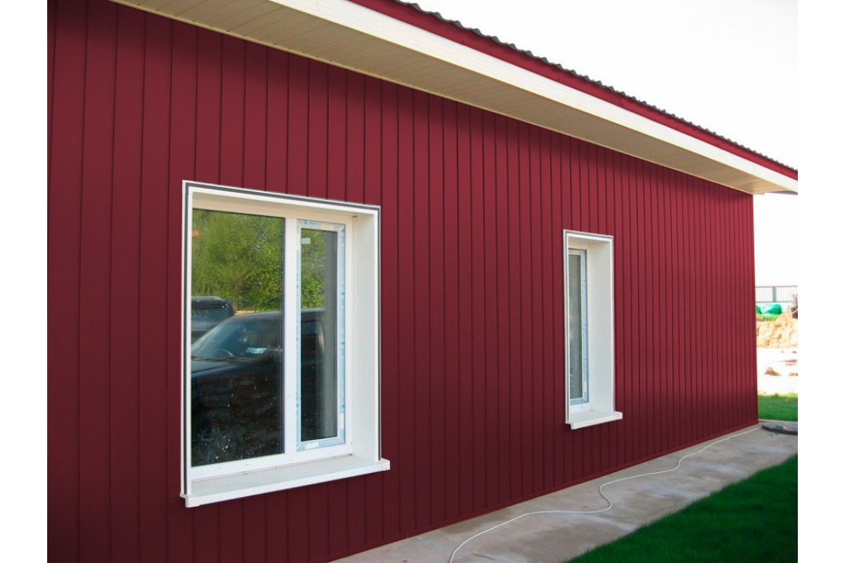 Вишневый цвет металлического сайдинга востребован благодаря своей практичности. Он прекрасно выделяется на фоне природных ландшафтов в любое время года, при этом на нем не сильно заметна пыль и другие мелкие загрязнения.