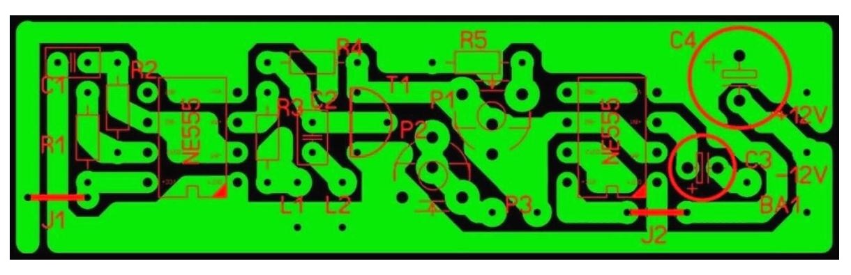 Самой сложной частью устройства является, конечно же, электроника, поэтому с нее и целесообразно начать. В первую очередь нужно сделать печатную плату. Всего есть несколько вариантов плат, в зависимости от используемых радиоэлементов. Есть плата для NE555, а есть плата на транзисторах. Все необходимые файлы для создания платы есть к статье. Также в интернете можно найти и другие варианты плат.