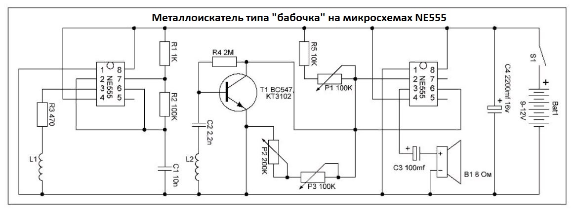Расположение элементов связано с принципом работы. Схема выполнена в виде двух генераторов, работающих на одной частоте. При подключении к ним одинаковых катушек, создается индукционный баланс. Стоит попасть в электромагнитное поле постороннему предмету, обладающему электропроводимостью, как баланс поля разрушается.