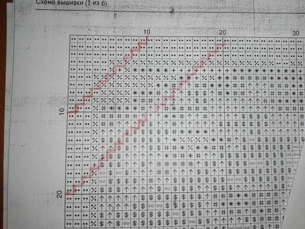 На схему сделайте разметку, прочертите квадраты или проведите линии по диагонали. По расположению символов отметьте, как будете выстраивать свою работу и управлять парковкой нити. Стрелочками укажите направление четных и нечетных рядов. Лучше 7 раз изучить схему, чем один раз неправильно начать и исправлять ошибки. Приобретите 2 прозрачных маркера, одним будете отмечать уже отшитую работу, другим отмечайте клеточки, куда припарковали иглу с ниткой.