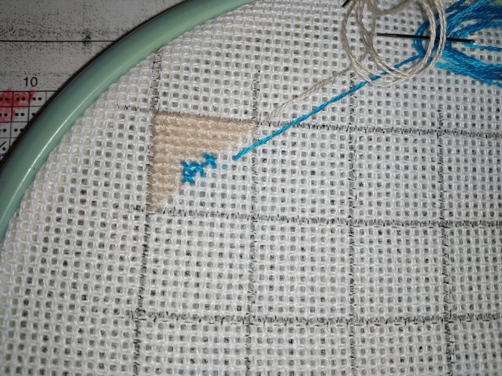 Бывают моменты, когда один-два квадрата выходят за границы первого участка, но больше этот цвет там не встречается. Не оставляйте их на потом, шейте сразу. Допускаются небольшие нарушения четких границ квадрата.