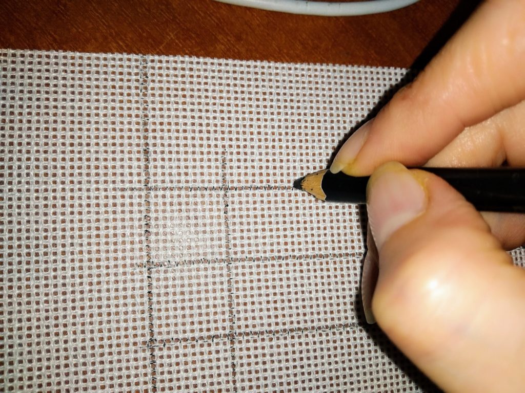 - Разметка канвы. Расчертить канву нужно на квадраты 10 на 10 клеточек, чтобы она была сопоставима со схемой и при вышивке не возникало сложностей в ориентировании.