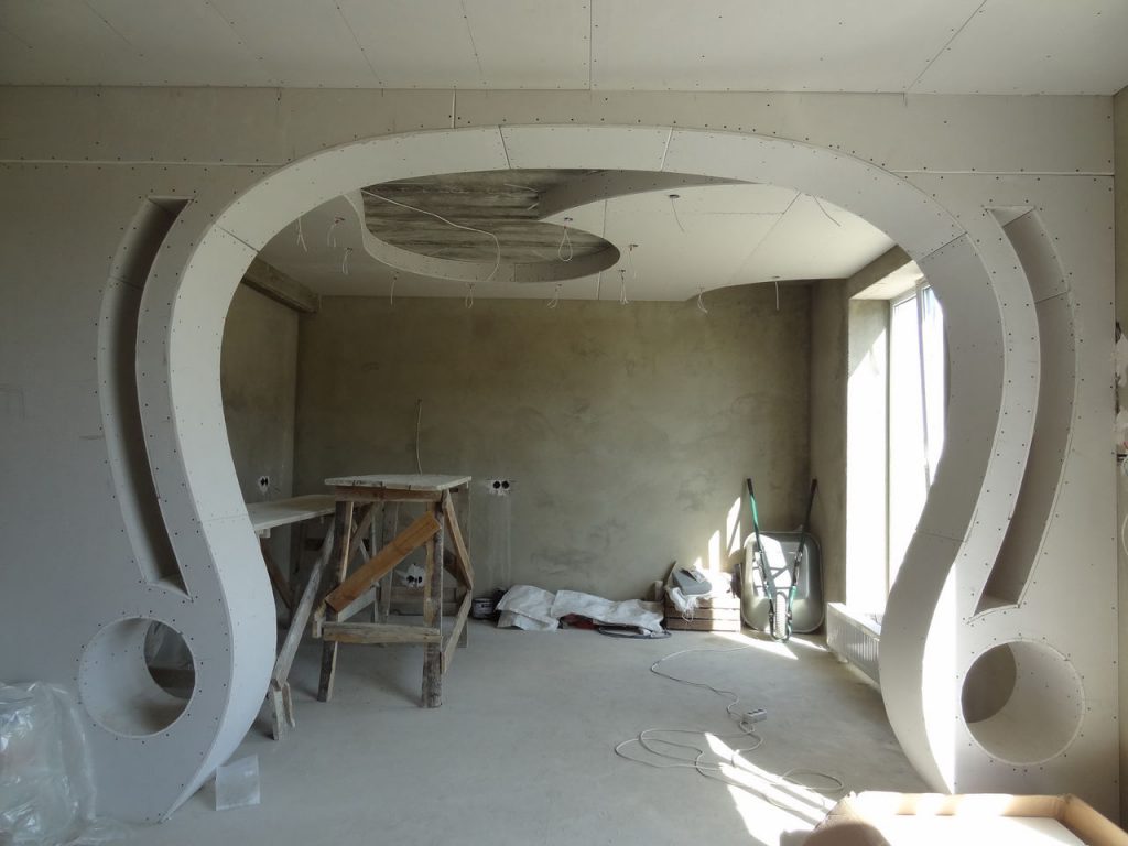 Главное: Из-за свойств гипса арку из него можно выполнить любой комбинации и изгиба. Это реально благодаря увлажнению гипса и отделке его специализированным валиком-ежиком. В данном варианте гипсоволокнистый лист становиться податлив на изгиб.