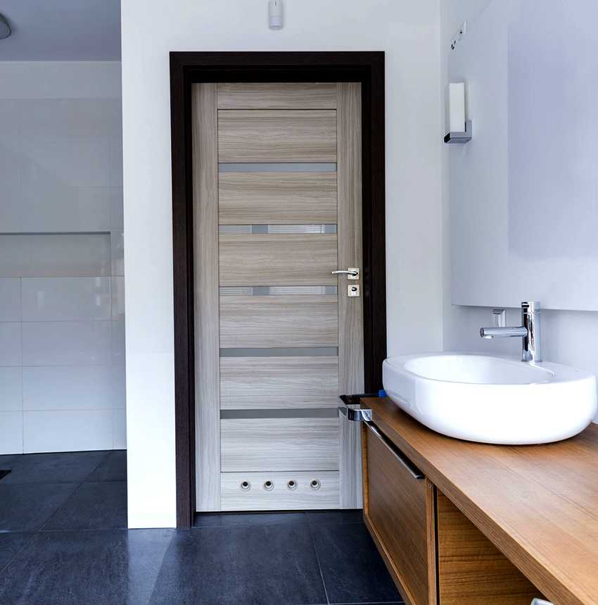 - высокие показатели влагостойкости. Наличие полимерной пленки предотвращает попадание влаги в деревянные элементы полотна. Благодаря этому свойству, экошпонированные двери могут устанавливаться в ванной, на кухне и других помещениях с высокой степенью влажности;