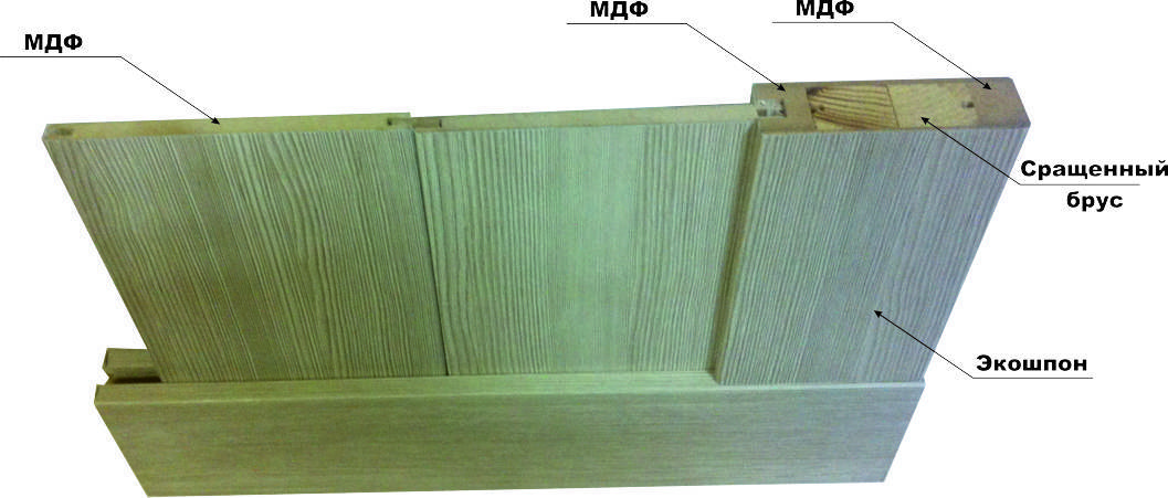 Межкомнатные дверные блоки из поливинилхлорида отделываются специальной пленкой. Каркас содержит бруски, выполненные из хвойных пород дерева. Перед производством последние проходят тщательную проверку на присутствие сучков и других дефектов. В качестве наполнителя для большинства моделей используют наиболее доступный вариант — сотовый картон, хотя могут применяться МДФ или ДСП.