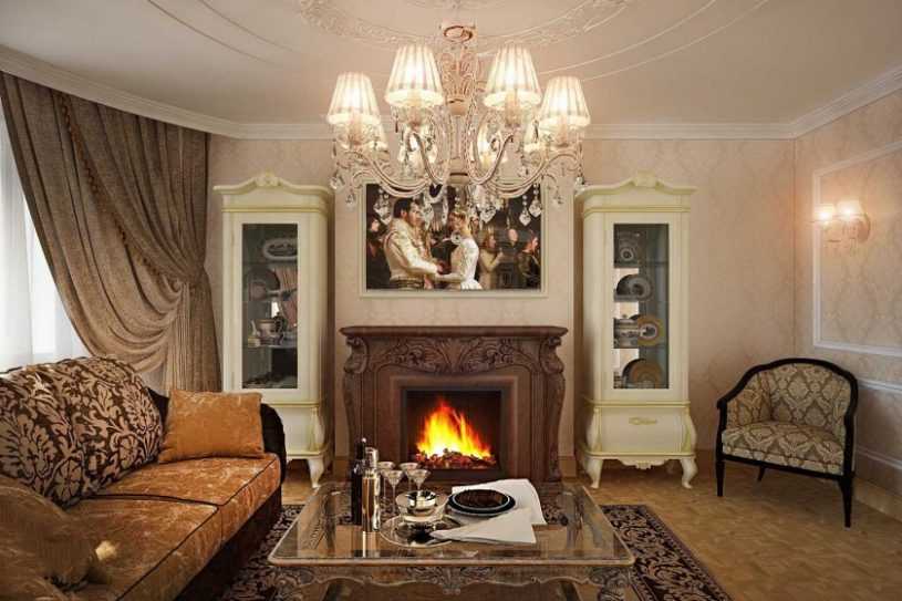 Уместным будет искусственный камин Важно уделить внимание освещению, оно должно быть рассеянным, лучше несколько небольших источников света, чем одна люстра по центру