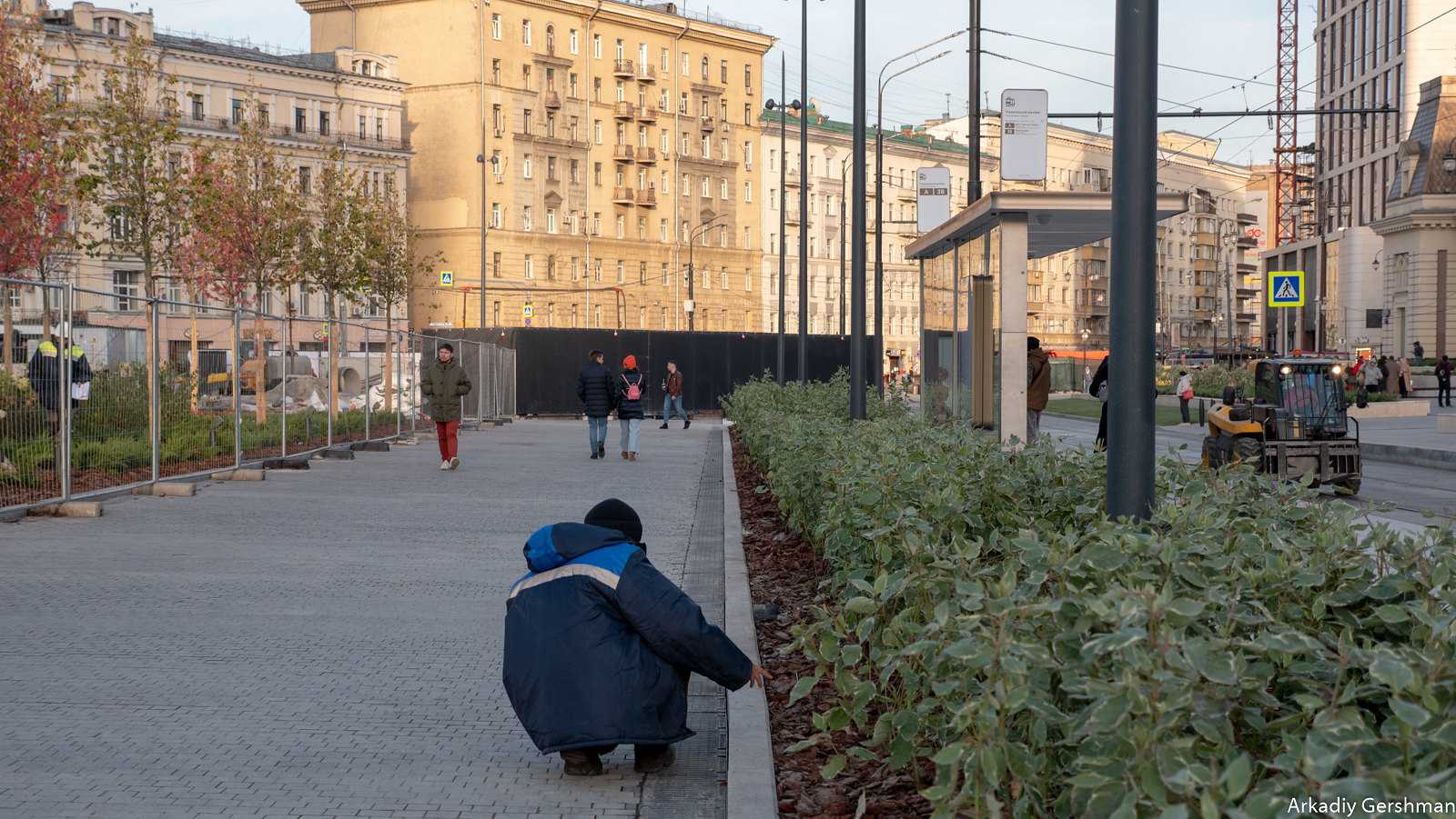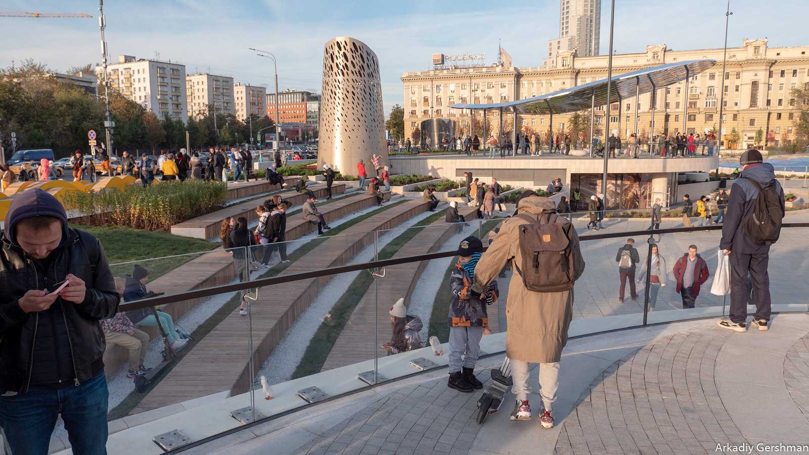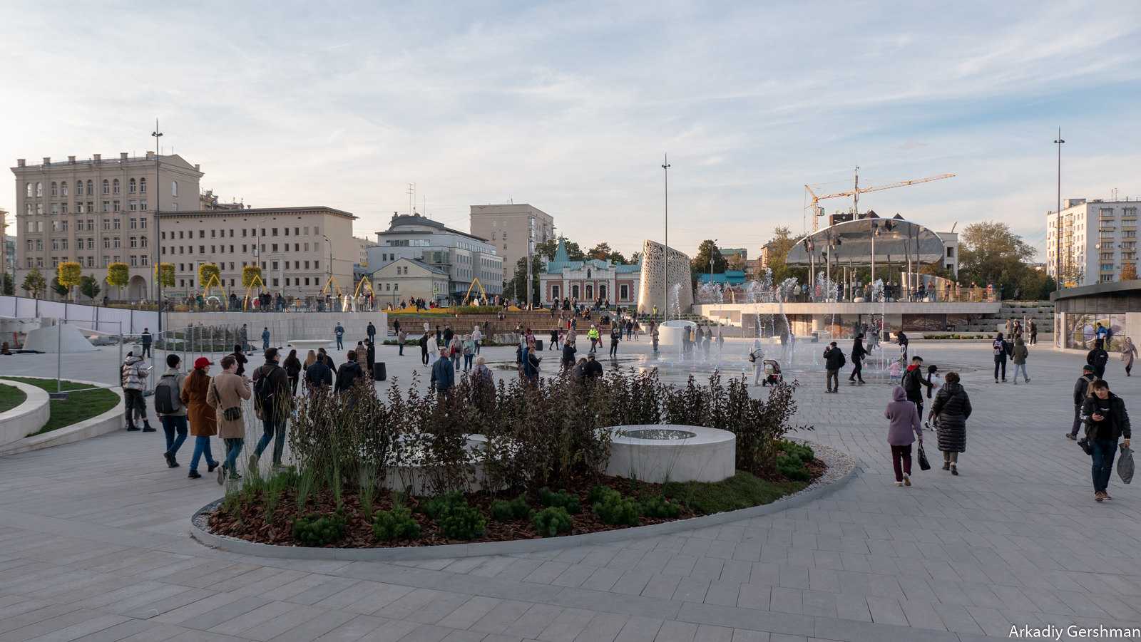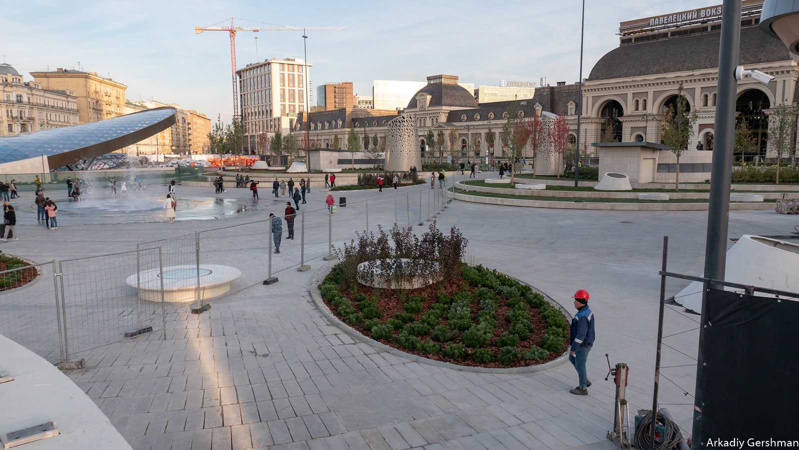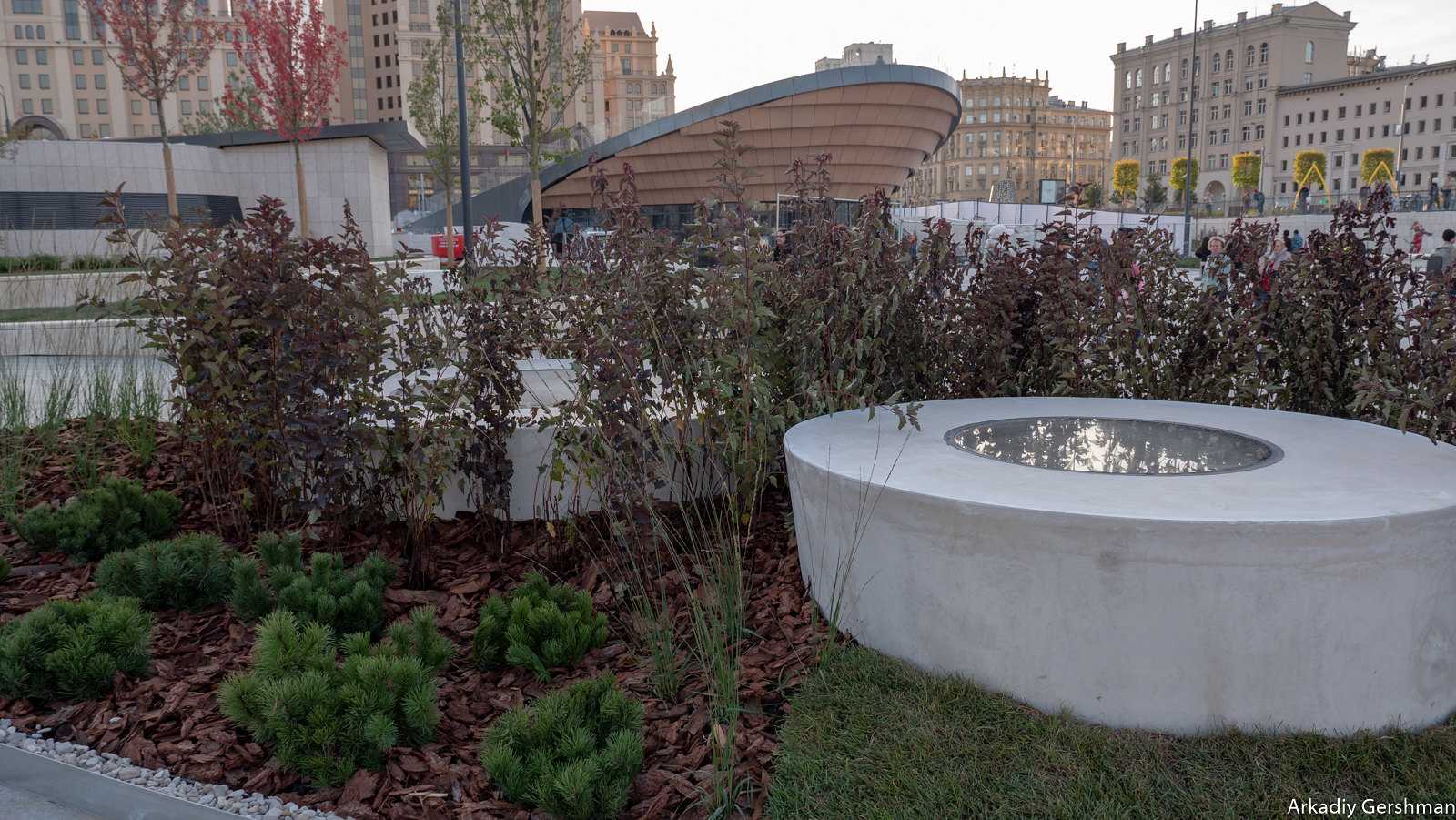 Как мы помним, под площадью сплошной бетон, но это не помешало озеленить её. По сути, это мини-Зарядье — там тоже всё построено и высажено на эксплуатируемой кровле.