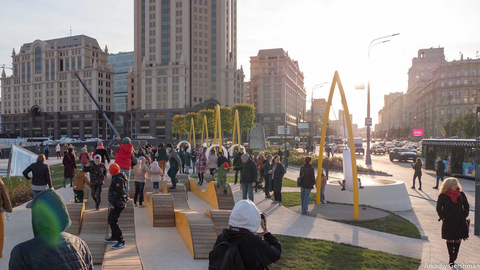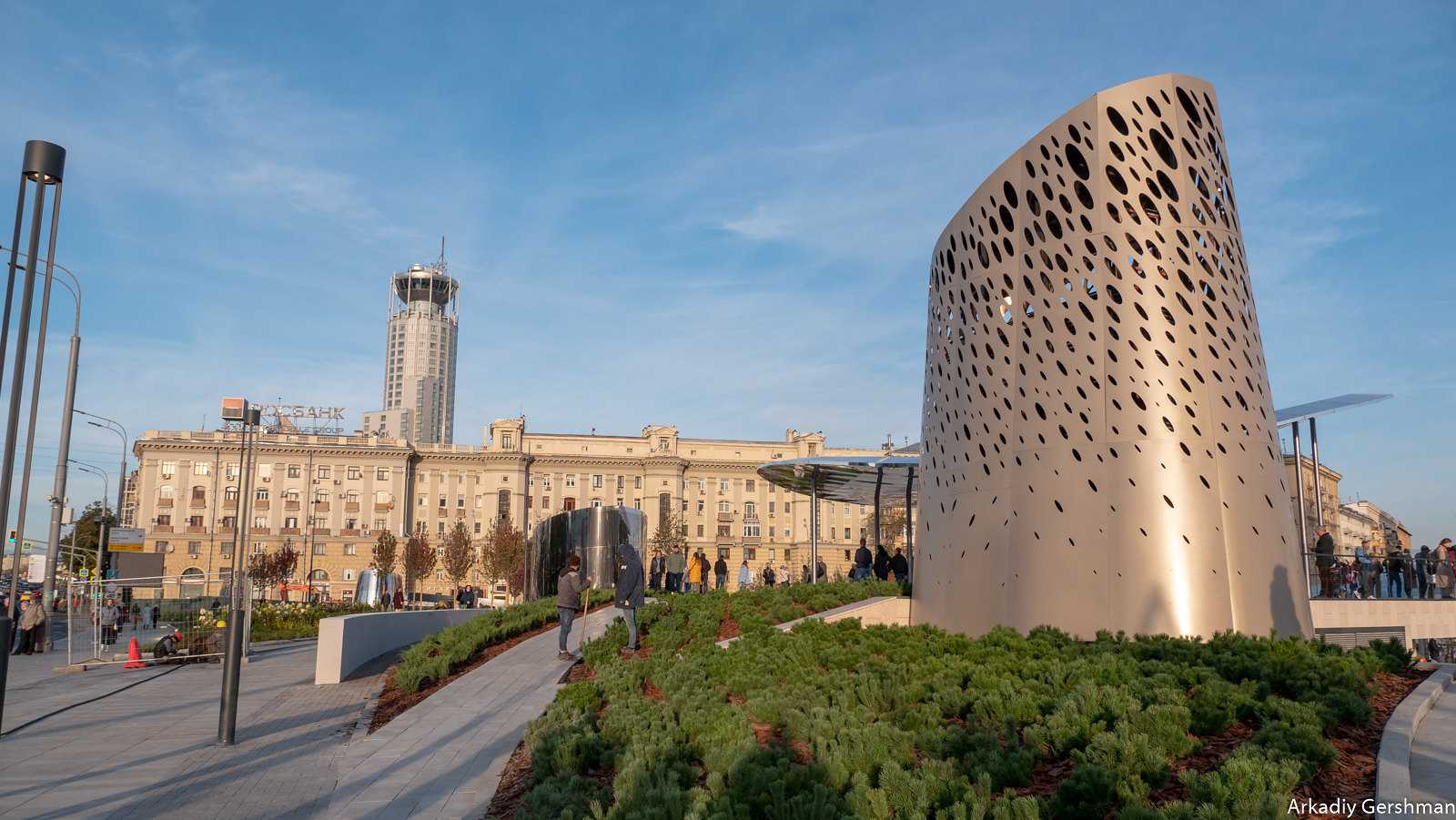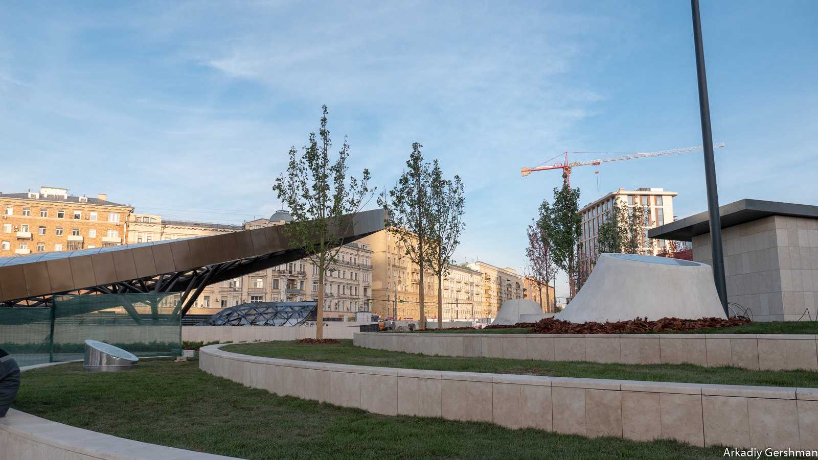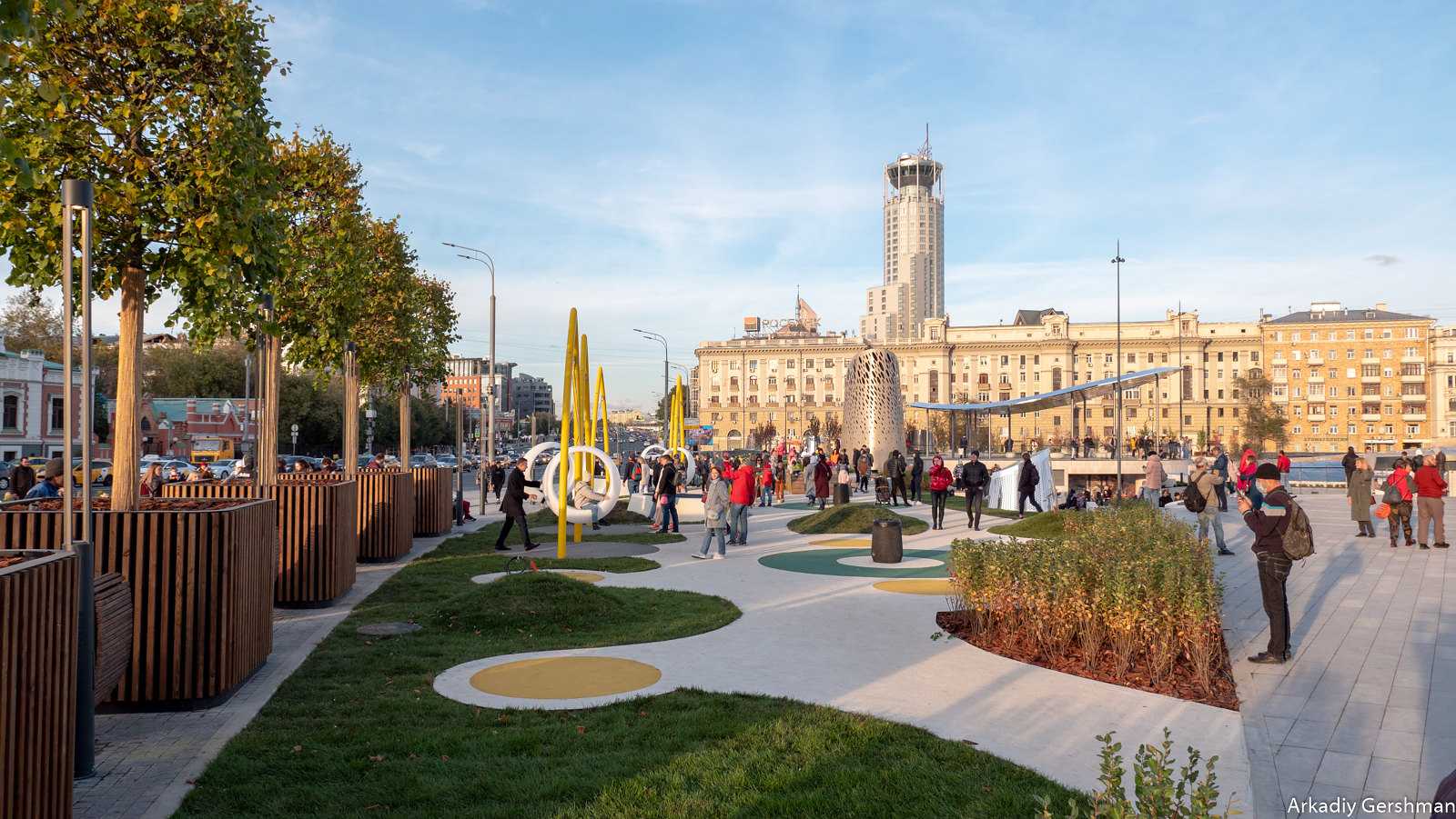 Как мы помним, под площадью сплошной бетон, но это не помешало озеленить её. По сути, это мини-Зарядье — там тоже всё построено и высажено на эксплуатируемой кровле.