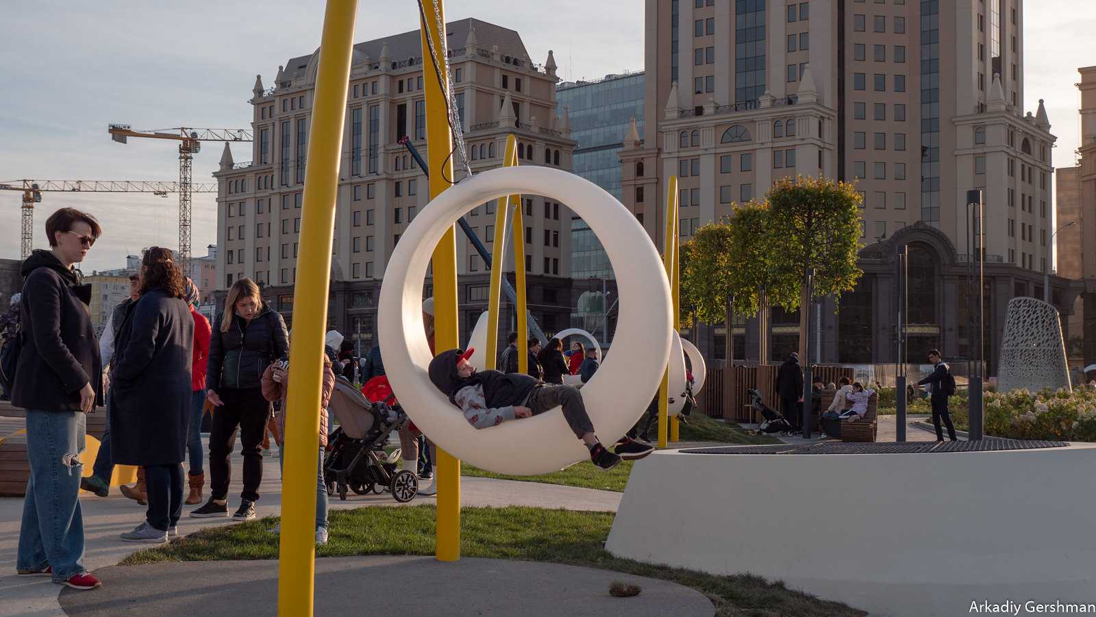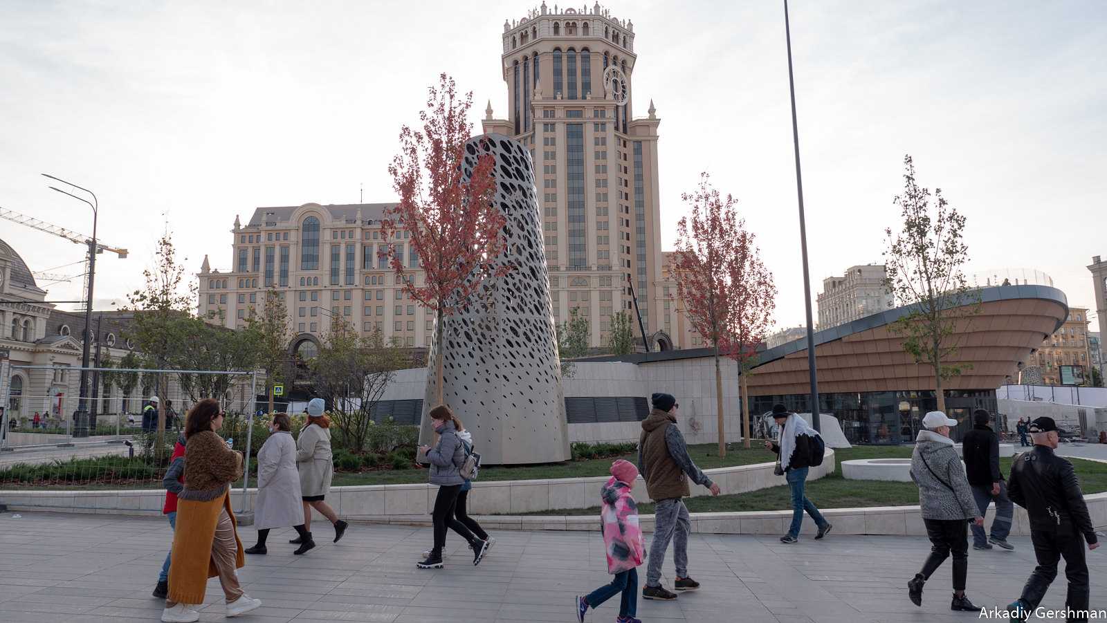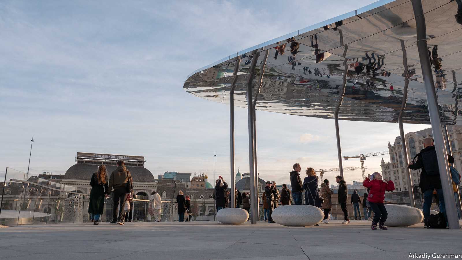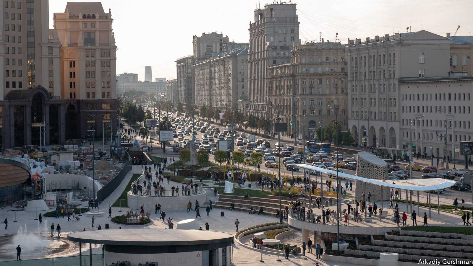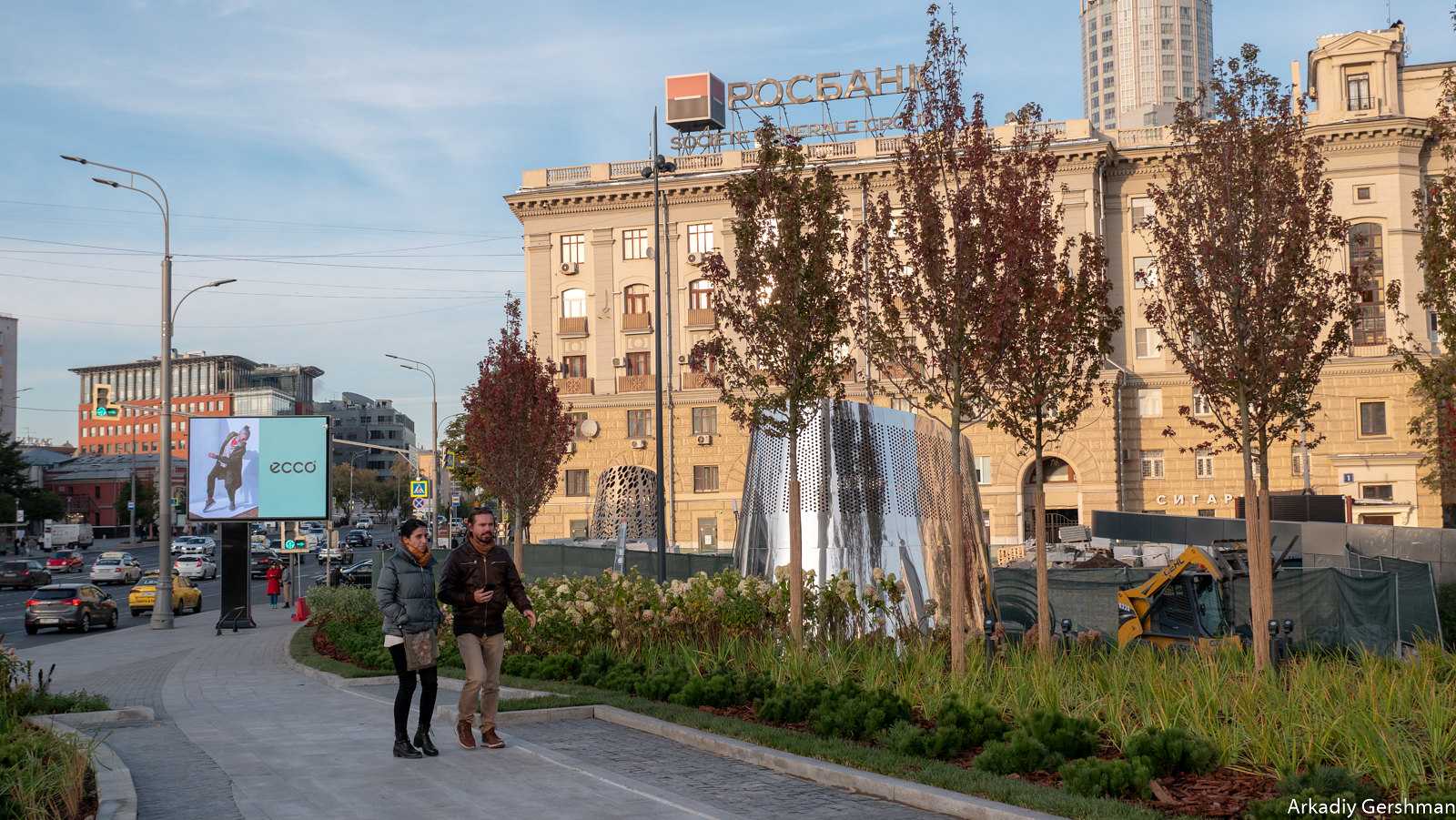 Как мы помним, под площадью сплошной бетон, но это не помешало озеленить её. По сути, это мини-Зарядье — там тоже всё построено и высажено на эксплуатируемой кровле.