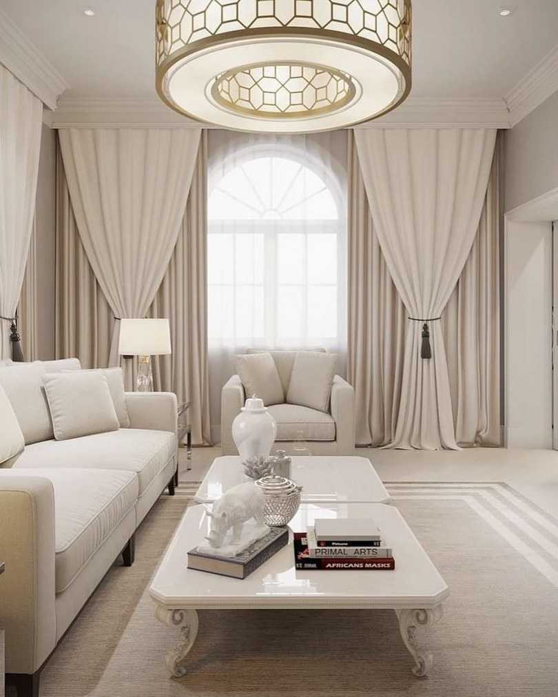 - Современные идеи для бежевого интерьера гостиной предлагают как гармоничные варианты в той же гамме – песочный, кремовый, персиковый, так и контрастные – шоколадный, черный, фиолетовый, красный. Впишутся в теплую обстановку серые, насыщенные асфальтовые, синие, изумрудные гардины.