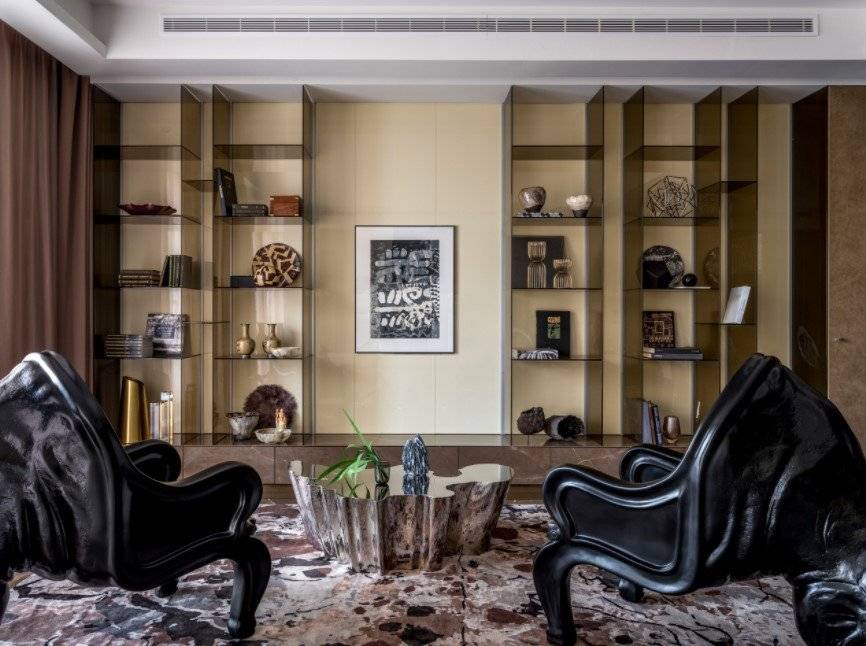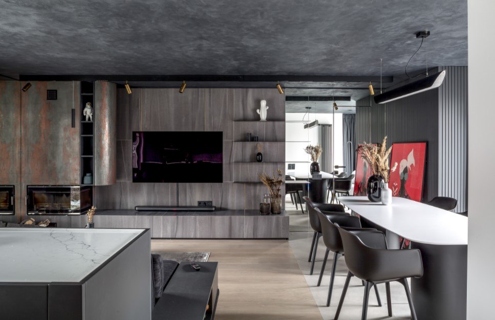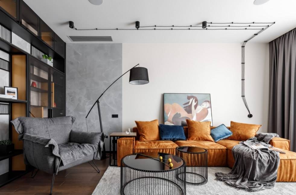 Распространено мнение, что использование тёмных оттенков, в особенности чёрного цвета, неприемлемо в маленькой комнате. Да это так, но если гостиная выполнена в стиле минимализм в светлых тонах, то один из элементов интерьера тёмного цвета добавит гостиной загадочности и глубины.