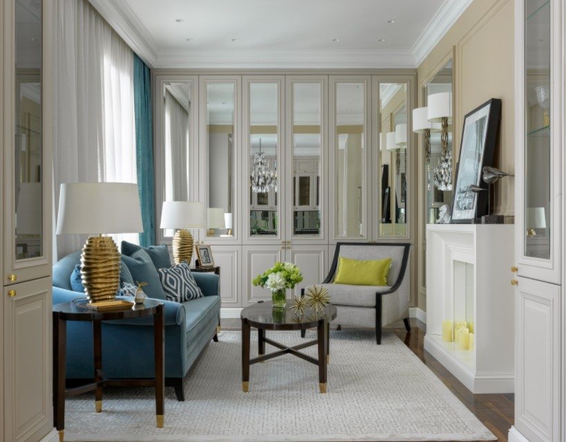 Зеркало – не менее важный атрибут для маленького зала или гостиной. Ведь оно привносит в комнату динамику, пространство и освещённость. Желательно вешать зеркало большего размера, чтобы достигнуть нужного эффекта.