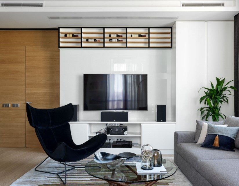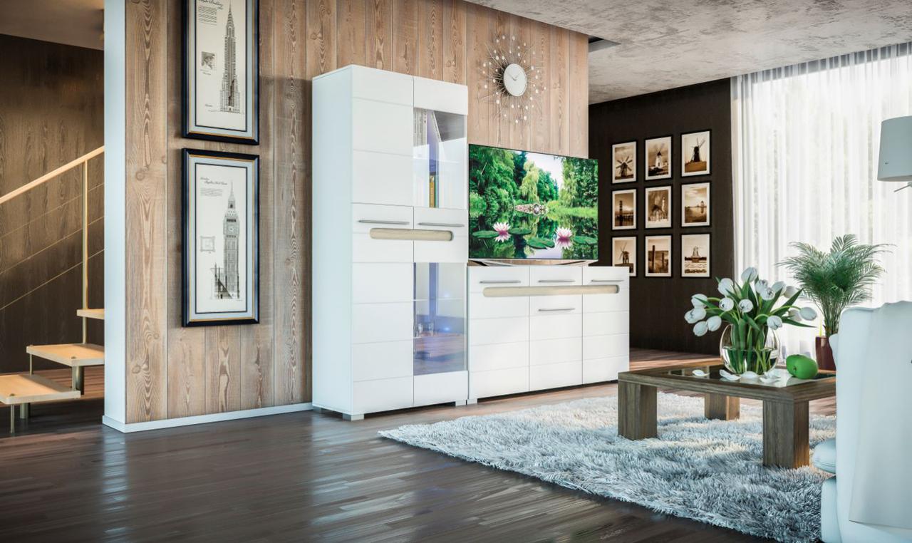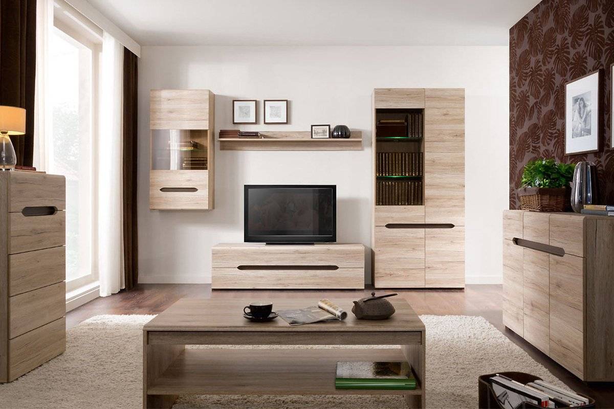 Идеальным решением для обустройства гостиной в стиле минимализм станут компактные модульные системы, отличающиеся простотой и лаконичностью. Конструкции с чёткими линиями и прямыми углами в этом случае подходят просто идеально. Минимализм – это однотонные гладкие фасады с минимальным декором либо его полным отсутствием, а также приглушенные оттенки, небольшое количество полок и дверей.