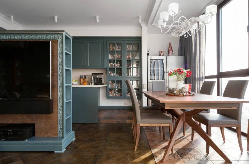 Дизайн гостиной в этом направление представляет собой комбинирование деталей, относящихся к консерватизму и модерну. Иными словами – эффектное убранство стен можно смело дополнить лаконичной мебелью или, наоборот, освежить спокойную цветовую гамму гостиной при помощи утончённых и роскошных аксессуаров.