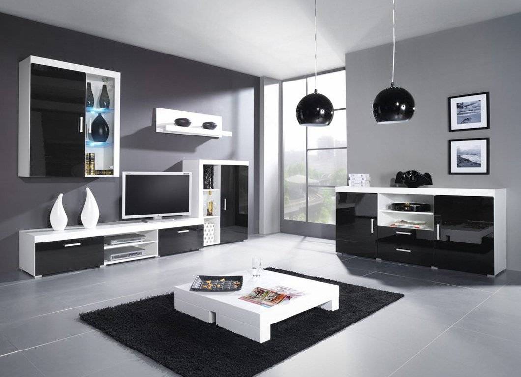 В современном интерьере гостиных всё чаще встречаются белые мебельные «стенки» из модулей, имеющие глянцевую или матовую поверхность. Право на существование также имеет сочетание нейтральных и чёрных оттенков, к примеру, бордовых, тёмно-зелёных или же вишнёвых.