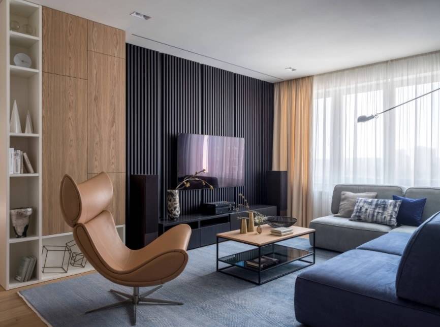 Так как предназначение гостиной заключается, в том числе, и в приеме гостей, соответственно, наличие тех или иных видов мягкой мебели обязательно.