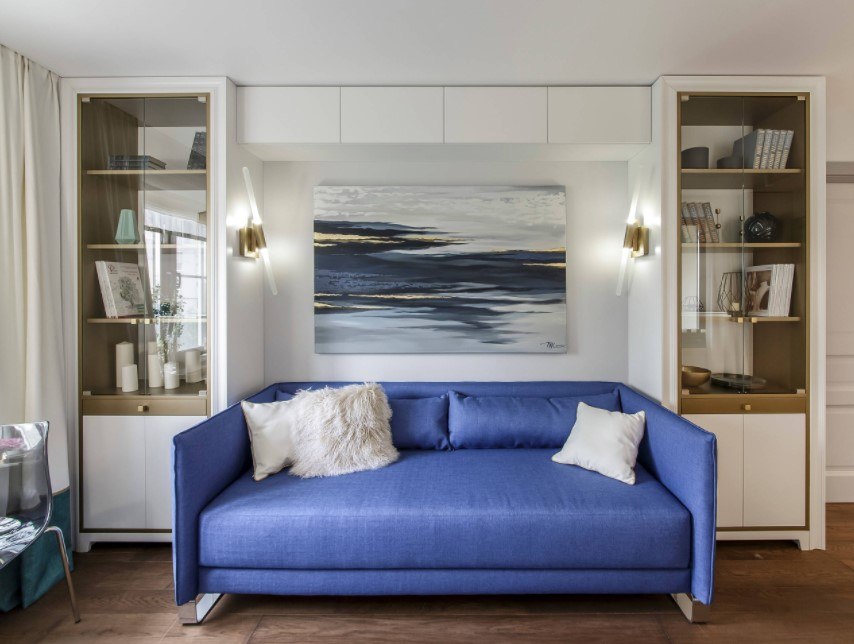 Когда в гостиной надо сделать место для сна, то в качестве такого места может использоваться диван-трансформер, который будет раскладываться и складываться по желанию.