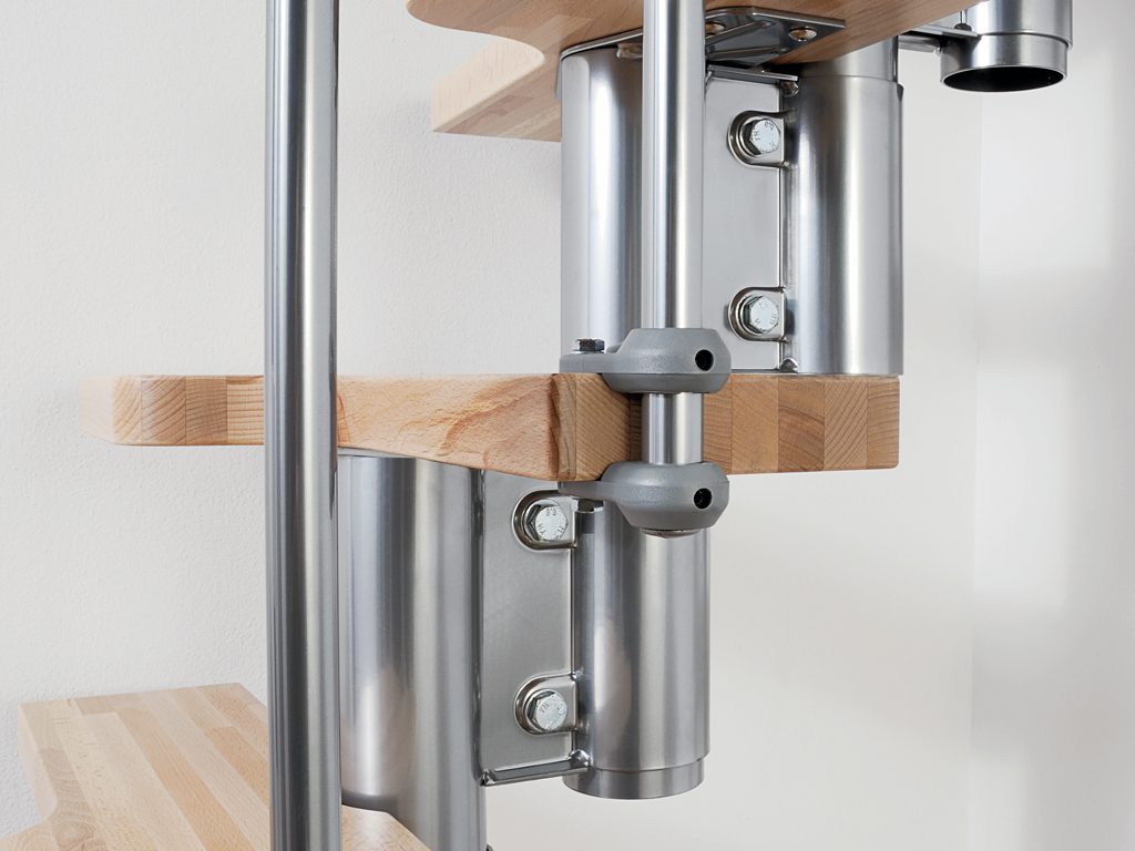 Крепления на резьбовых шпильках постепенно ослабевают, поэтому нужно периодически подтягивать гайки, чтобы изделие не шаталось. Использование шпилек не позволяет регулировать высоту ступеней, а на установку модели требуется больше времени. Для затягивания крепежа необходимо подобрать подходящие инструменты.