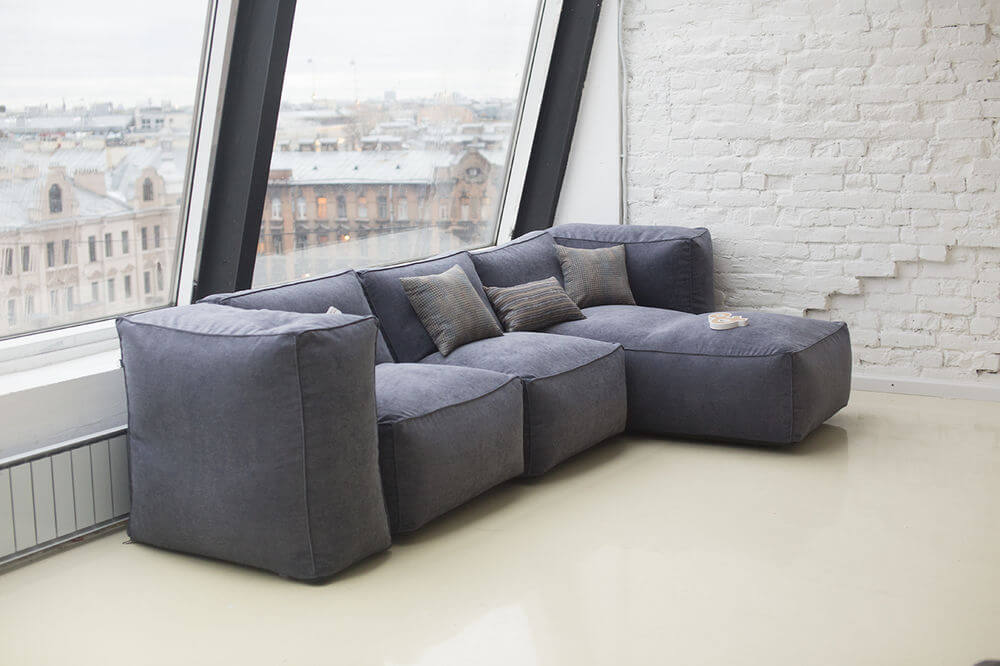 Логическим продолжением описанных выше моделей, стал бескаркасный модульный диван. Отличается он разделением чехла на несколько элементов. Это позволяет эффективнее использовать мебель, лучше вписывать ее в интерьер.