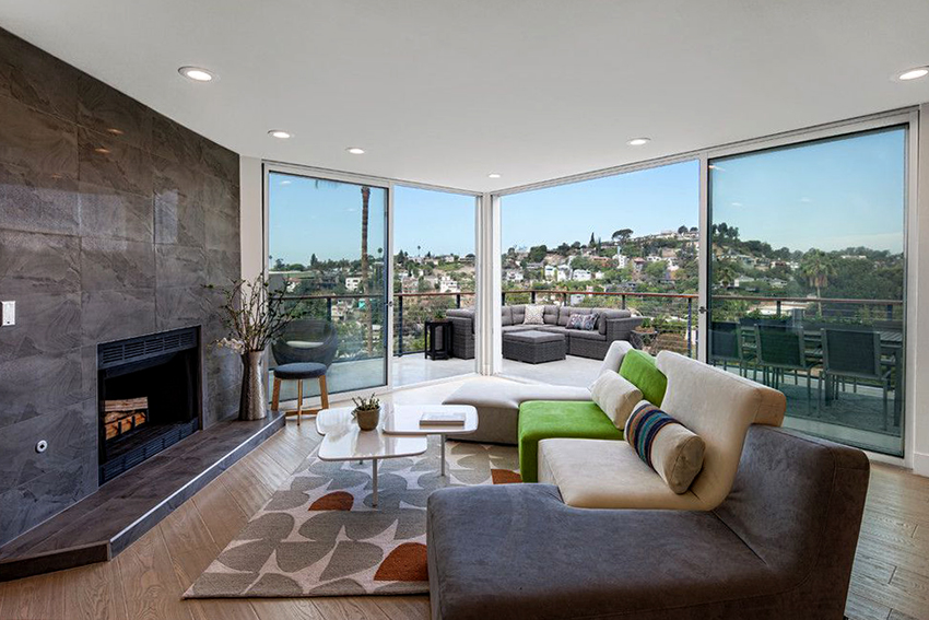 В центре. Зачастую в середине зала помещают красивые угловые диваны больших размеров. Их ставят перед телевизором или камином, в зависимости от интерьера. С их помощью четко определяется зона отдыха. Угловой диван можно дополнить стильным журнальным столом или креслами.