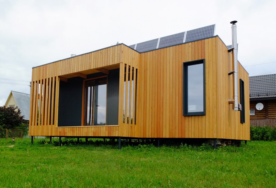 Такой дом с террасой и панорамными энергоэффективными окнами вполне подходит для постоянного проживания в климатических условиях средней полосы