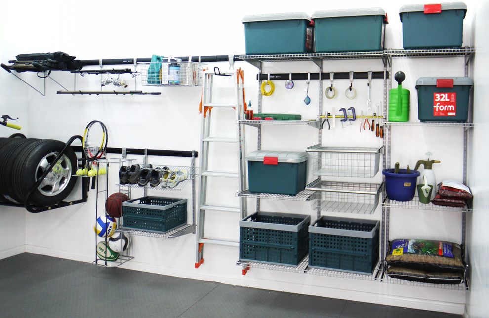 Открытая модульная система хранения для гаража с различными полками, ящиками и крючками