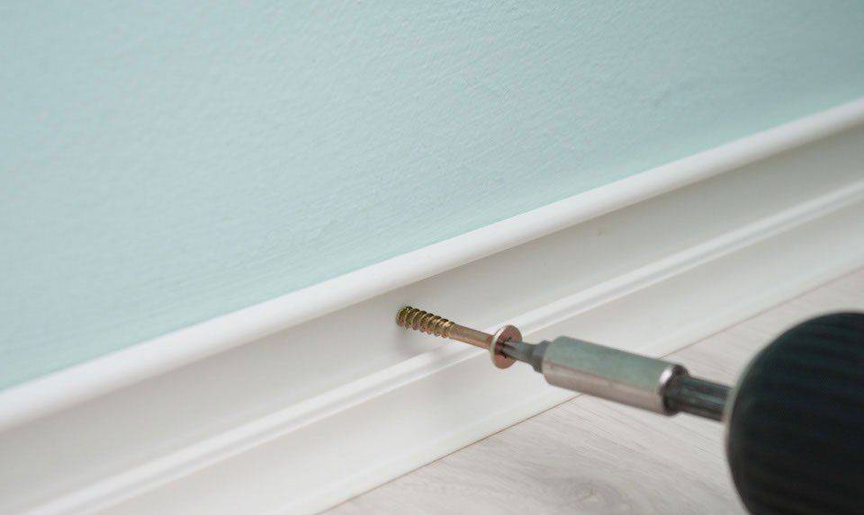 Закрепление плинтуса на саморезы. В этом случае планки прикручиваются непосредственно к стене и при необходимости могут быть демонтированы. Правда, процесс демонтажа займет больше времени, чем в первом варианте фиксации. Однако, необходимо отметить, что если для деревянного плинтуса такое крепление окажется прочным, то для МДФ-изделий — все же недостаточно надежным. Поэтому, если выбирается этот способ, то его нередко комбинируют с клеем, а значит, быстрый демонтаж планок будет невозможен.
