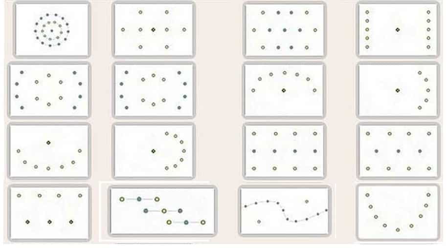 Одной строгой конфигурации расположения спотов на гипсокартонном потолке нет, каждый выстраивает её сам. Главный вопрос: какое освещение должны давать споты – полное или зональное? На основе этого и формируется схема расположения светильников. Ограничений никаких нет, но обычно используют одну из трёх конфигураций:
