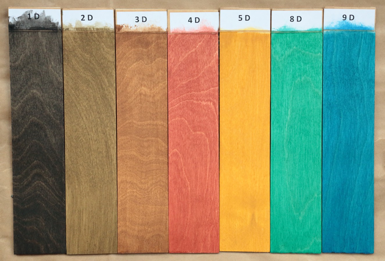 Цвет морилки верхнего слоя может быть любым: коричневым, чёрным, серым. Будут окрашиваться только годовые кольца, поле останется белоснежным. На фото морилки различных типов. Здесь хорошо видно их контрастность.