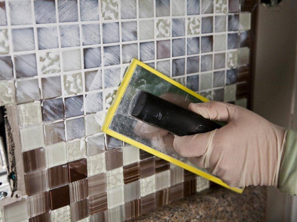 Затирка на фартук из мозаики на кухню наносится как минимум через сутки, когда клей надежно схватится. Затирочную смесь наносят резиновым шпателем, выжидают 30-60 минут (пока она начнет схватываться, но еще не высохнет окончательно), после стирают ее с поверхности плитки влажной губкой.