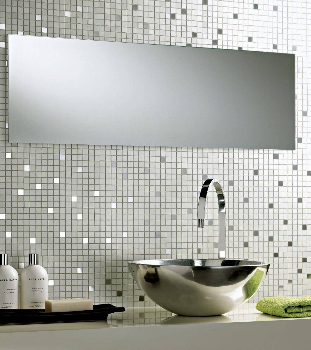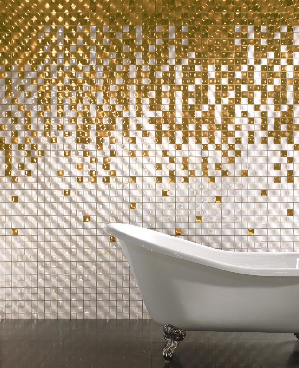 Создать эффект роскоши, блеска можно разбавив мозаику зеркальными вставками. Если при этом в ванной будет правильное освещение, то все будет сверкать.
