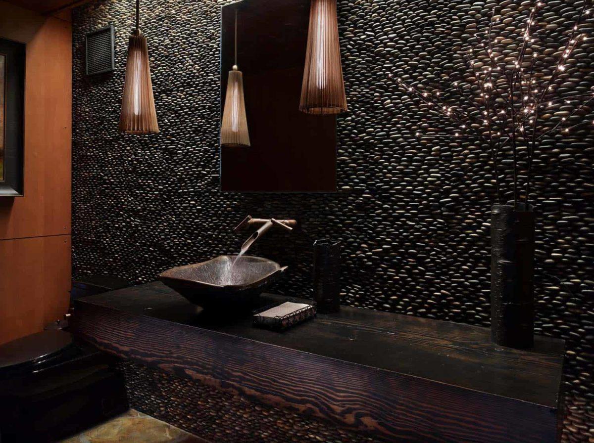 Каменная мозаика в ванной символизирует сдержанную роскошь. Другие плюсы подобной отделки: