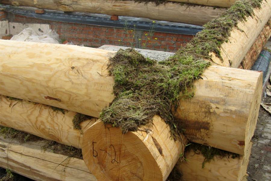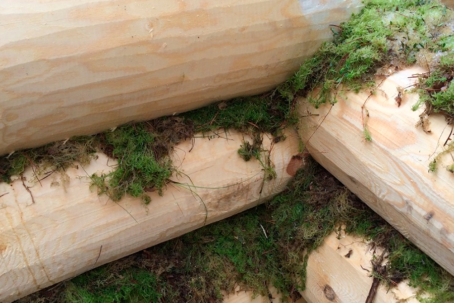 Уложенные бревна сруба и межвенцовый утеплитель между ними