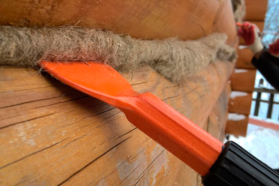Существует два способа конопачения – «в набор» и «в растяжку». Первый используют для устранения широких зазоров между бревнами, второй обычно применяют при первичной конопатке, когда зазоры еще узкие.