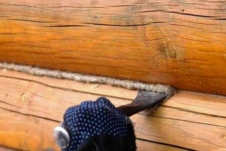 Вслед за процессом уплотнения могут появляться щели, в которые вкладываются фрагменты утеплителя. В случае если применялась пакля, из нее сворачивают жгут определенной толщины или отсоединяется фрагмент конкретной длины от ленты, который также вбивают конопаткой и киянкой, пока не будет достигнут пружинящий эффект. Данная операция повторяется, пока все щели не будут заполнены, после чего можно переходить к новому участку.