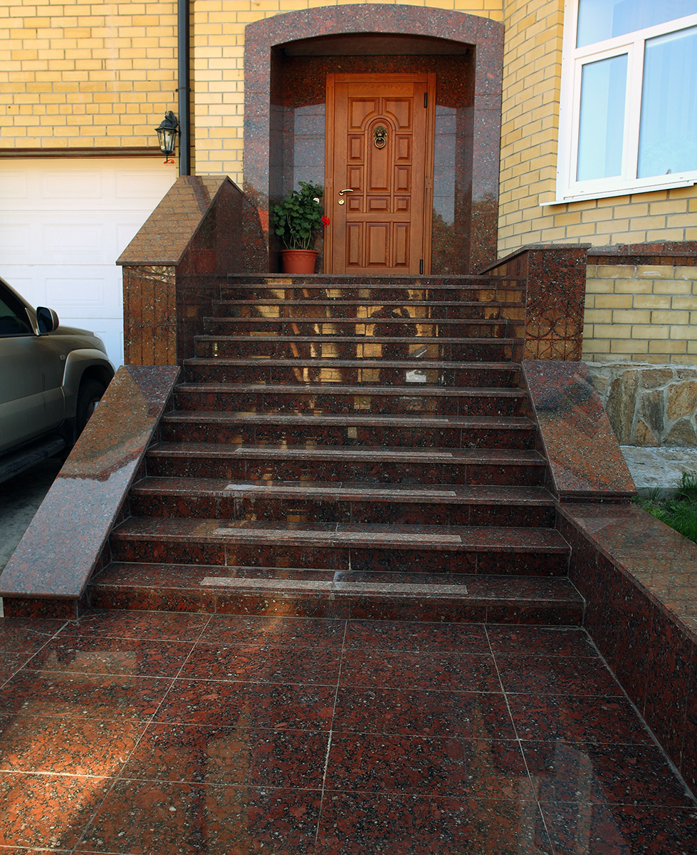 Гранитные лестницы очень часто можно увидеть при входе в офисы, рестораны и гостиницы. Такие ступени выглядят дорого и говорят о статусе организации. Для большей безопасности на край каждой ступени крепится резиновая полова или делаются специальные полосы.