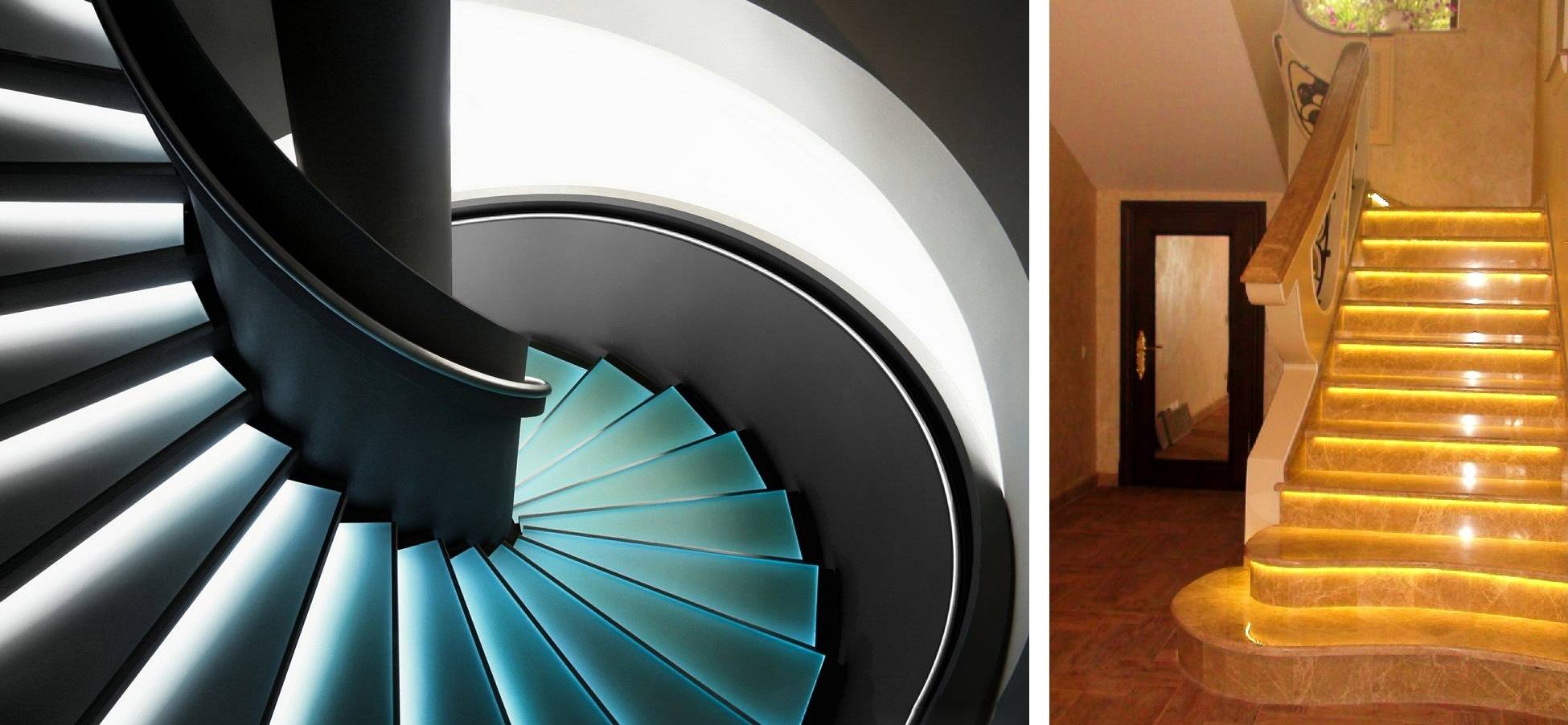 Мраморные лестницы в основном выполнены в светлых пастельных тонах. Они будут выглядеть особенно дорого и необычно на фоне контрастной отделки или фигурных перил. Если сделать подсветку каждой ступени, то конструкция приобретёт современный и стильный вид. Это дизайнерское решение активно используется в интерьерах в стиле фьюжн или хай-тек.
